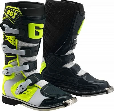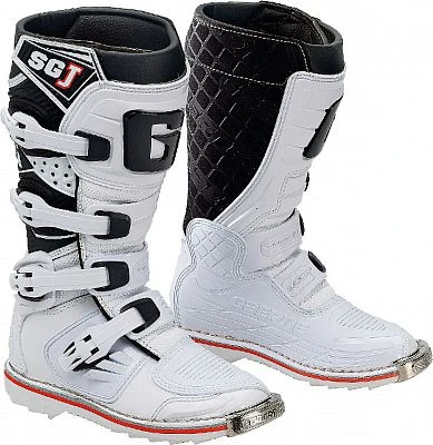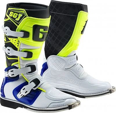 Der kleine Bruder des SG12 Crossstiefels für Youngsters/Kids. Mit dem SGJ bietet Gaerne einen HIGH-TECH-Stiefel auf dem Level für zukünftige Profis. Neben der umfangreichen Sicherheitsausstattung wie z. B. den Kunststoffteilen, der Stahleinlage in der Sohle und der Stahlkappe an der Stiefelspitze überzeugt der SGJ auch in Sachen Komfort, denn der perforierte Schaft sorgt für gute Belüftung, die extrem elastische Staubabdeckung verhindert wirksam das Eindringen von Schmutz und der bewährte Memory-Schaumstoff umschließt Ihren Fuß perfekt und ermöglicht somit ein absolut direktes und sicheres Fahrgefühl. Er ist für den Nachwuchs in Sachen Qualität, Sicherheit und Design einzigartig.