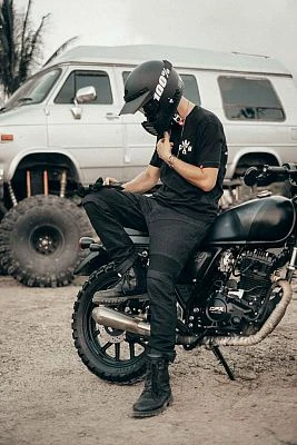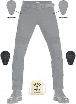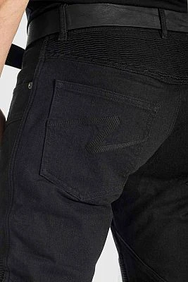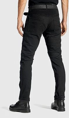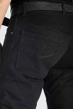 Diese schwarze Motorradjeans mit schmaler Passform und normaler Taille wurde mit viel Liebe zum Detail gefertigt. FĂŒr den Fahrer, der Vielseitigkeit, Komfort und Design schĂ€tzt, ist die KARLDO KEV 01 eine klare Wahl.
